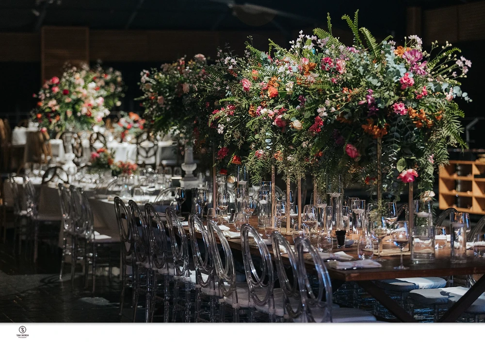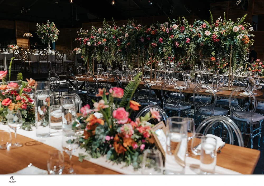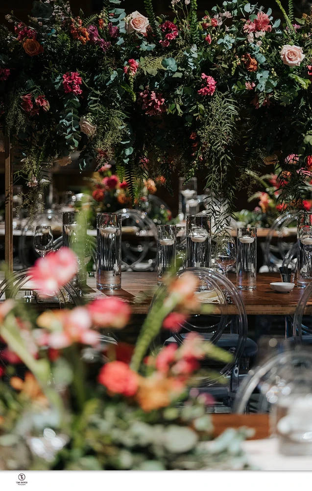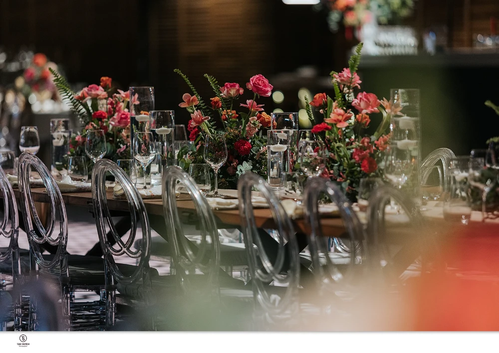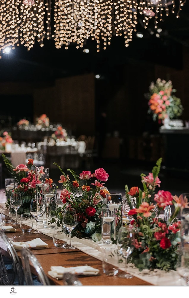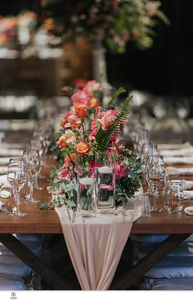 החתונה התקיימה בסוף החורף, בתוך האולם של חוות רונית . כדי לשדרג את האווירה הוספנו צבעים צבעוניים ושמחים – שילוב של ורוד וכתום, עם טוליפים שזוהרים בגוונים חמים. הטוליפים הוסיפו חיים ורעננות, והם היו נוכחים בכל פינה – מהשולחנות, דרך הקירות ועד במרכזי השולחן, ובכך יצרו תחושת חיבור טבעי ומרגש. התאורה החמימה, שכללה גם המון נרות, הוסיפה לאווירה הרומנטית והנינוחה, שגרמה לכל האורחים להרגיש בבית.