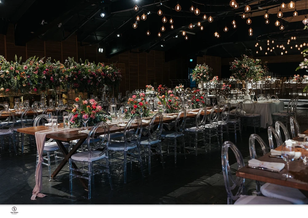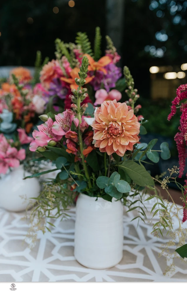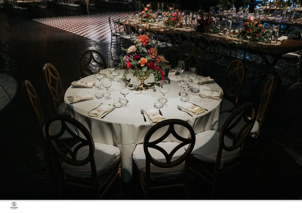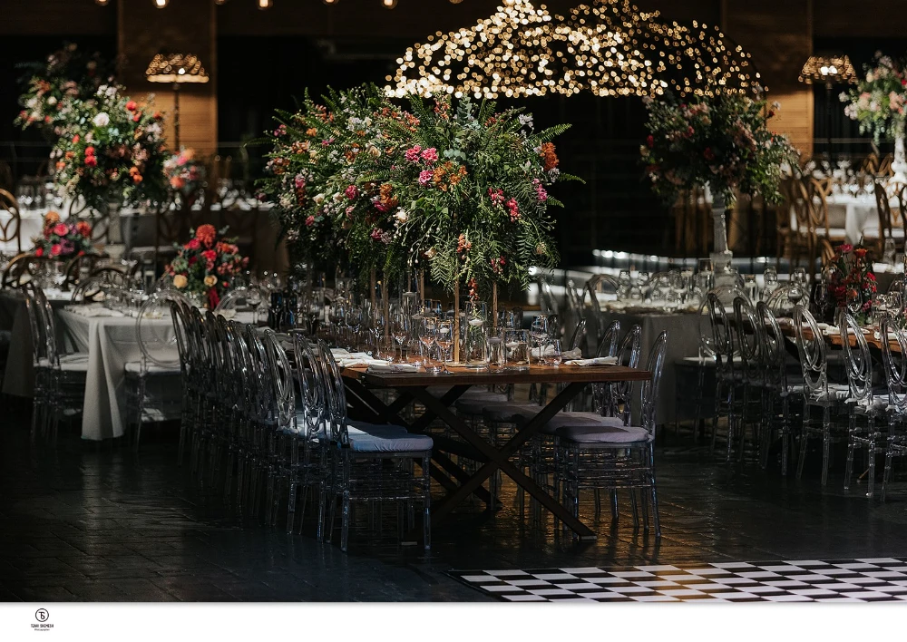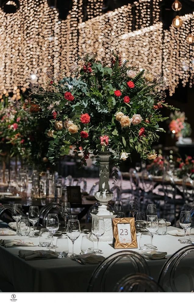 החתונה התקיימה בסוף החורף, בתוך האולם של חוות רונית . כדי לשדרג את האווירה הוספנו צבעים צבעוניים ושמחים – שילוב של ורוד וכתום, עם טוליפים שזוהרים בגוונים חמים. הטוליפים הוסיפו חיים ורעננות, והם היו נוכחים בכל פינה – מהשולחנות, דרך הקירות ועד במרכזי השולחן, ובכך יצרו תחושת חיבור טבעי ומרגש. התאורה החמימה, שכללה גם המון נרות, הוסיפה לאווירה הרומנטית והנינוחה, שגרמה לכל האורחים להרגיש בבית.