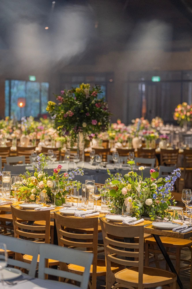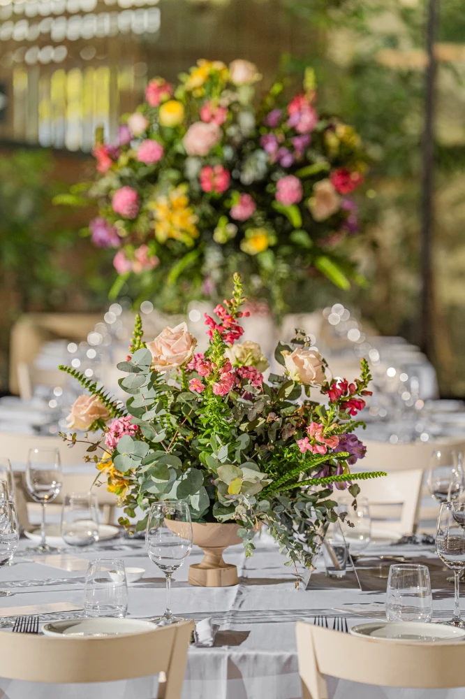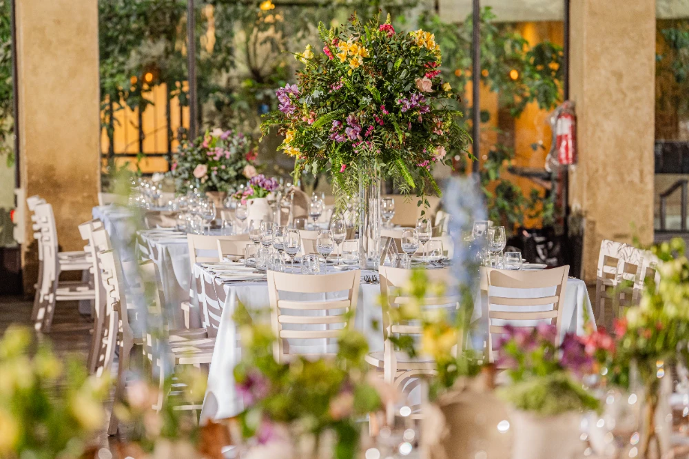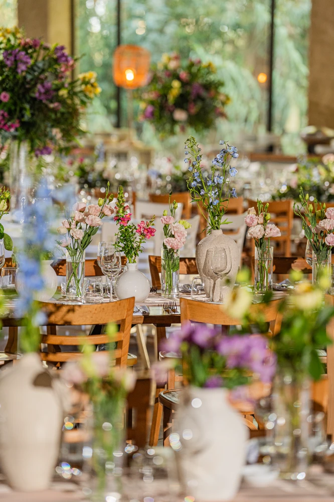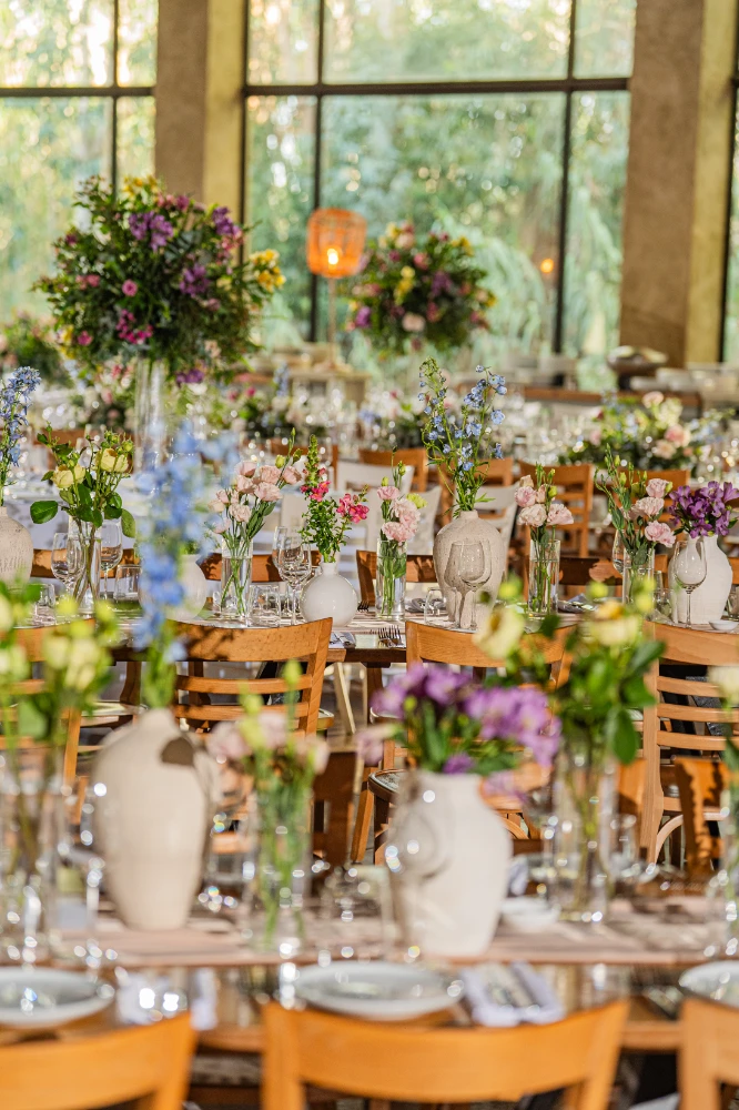 סידורי הפרחים היו מהממים ועשירים, עם שילוב של פרחים מיוחדים בגוונים סגול, תכלת, צהוב וורוד — כל סידור נבחר בקפידה כדי ליצור הרמוניה צבעונית ורומנטית שמוסיפה תחושת חגיגה לכל החלל.