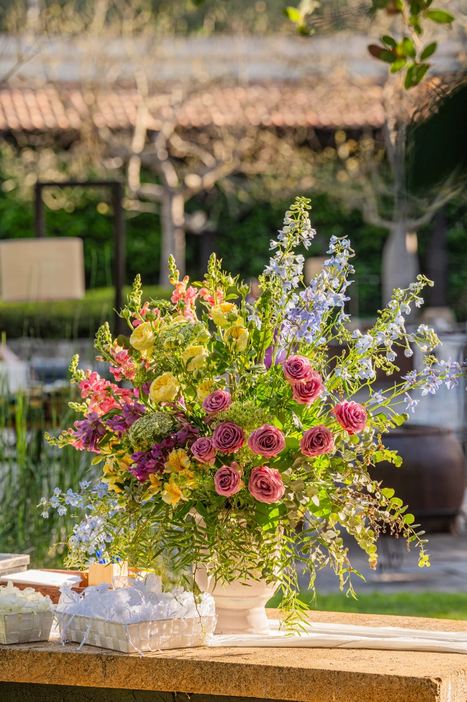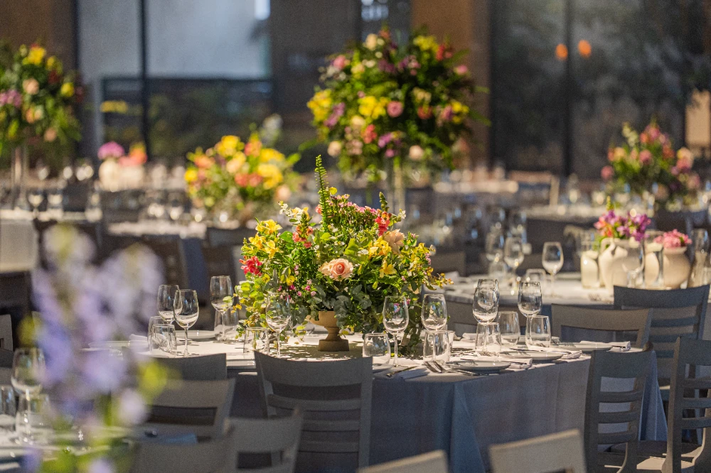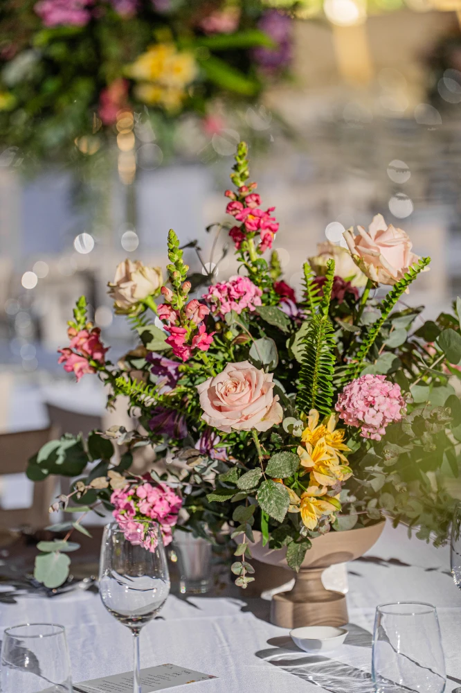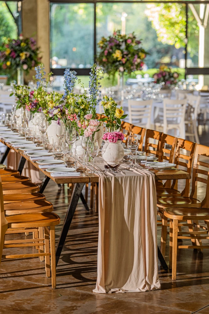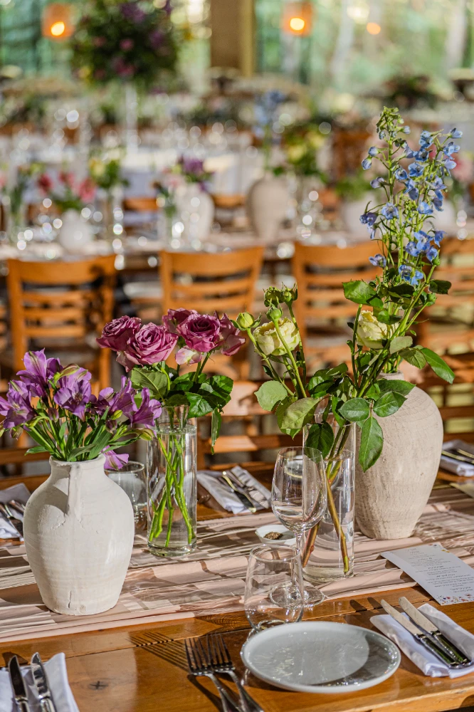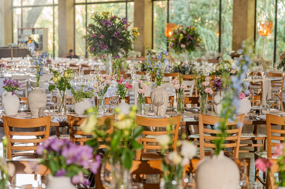 סידורי הפרחים היו מהממים ועשירים, עם שילוב של פרחים מיוחדים בגוונים סגול, תכלת, צהוב וורוד — כל סידור נבחר בקפידה כדי ליצור הרמוניה צבעונית ורומנטית שמוסיפה תחושת חגיגה לכל החלל.