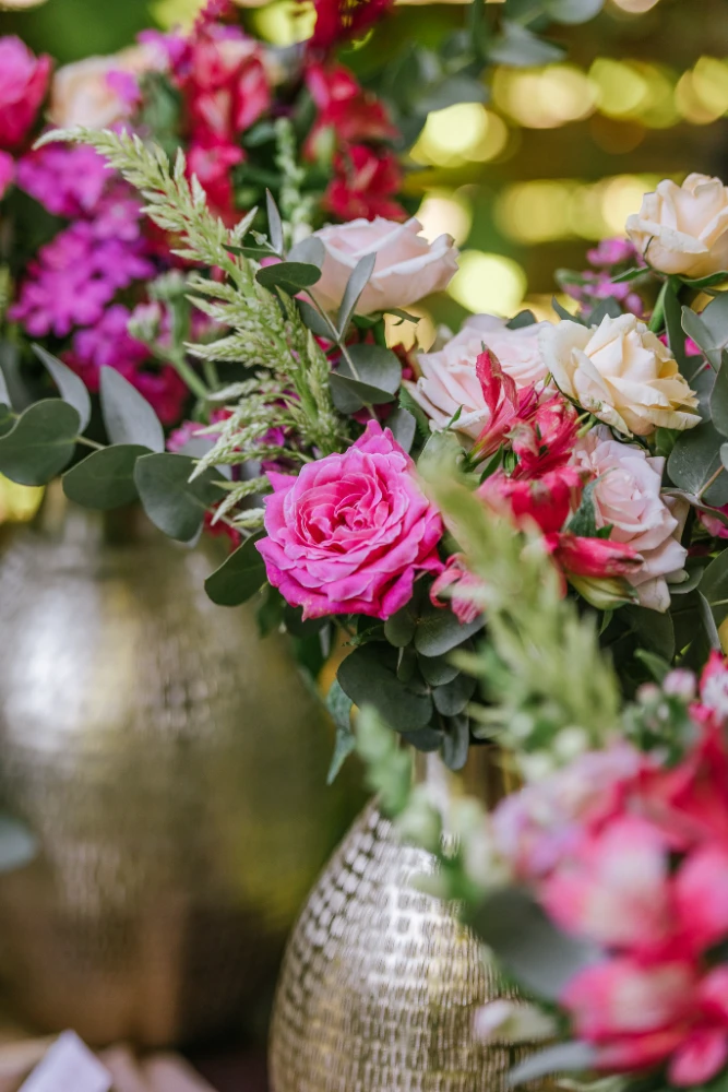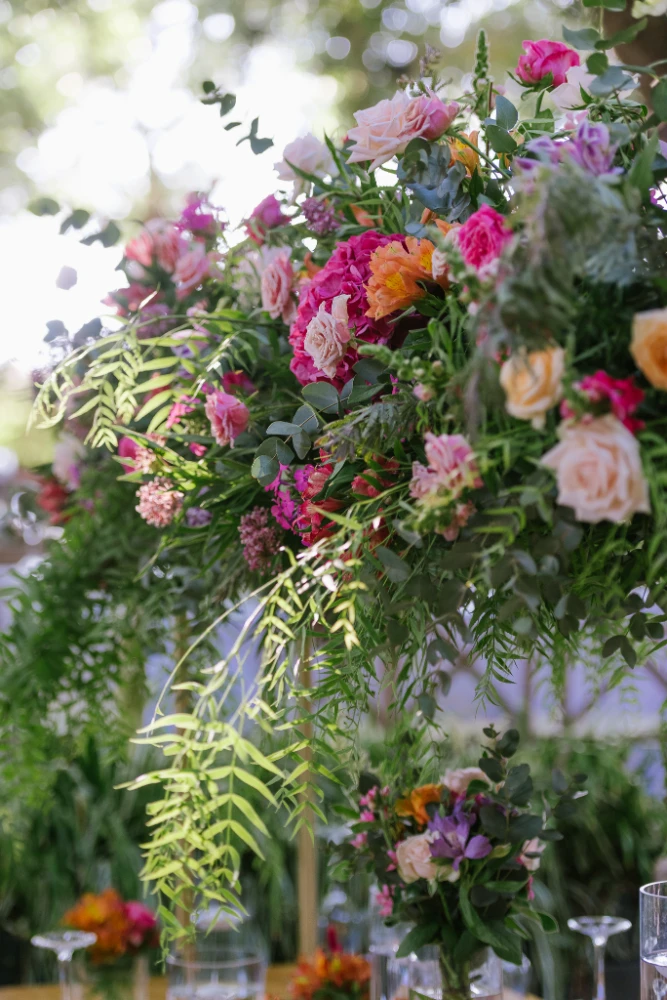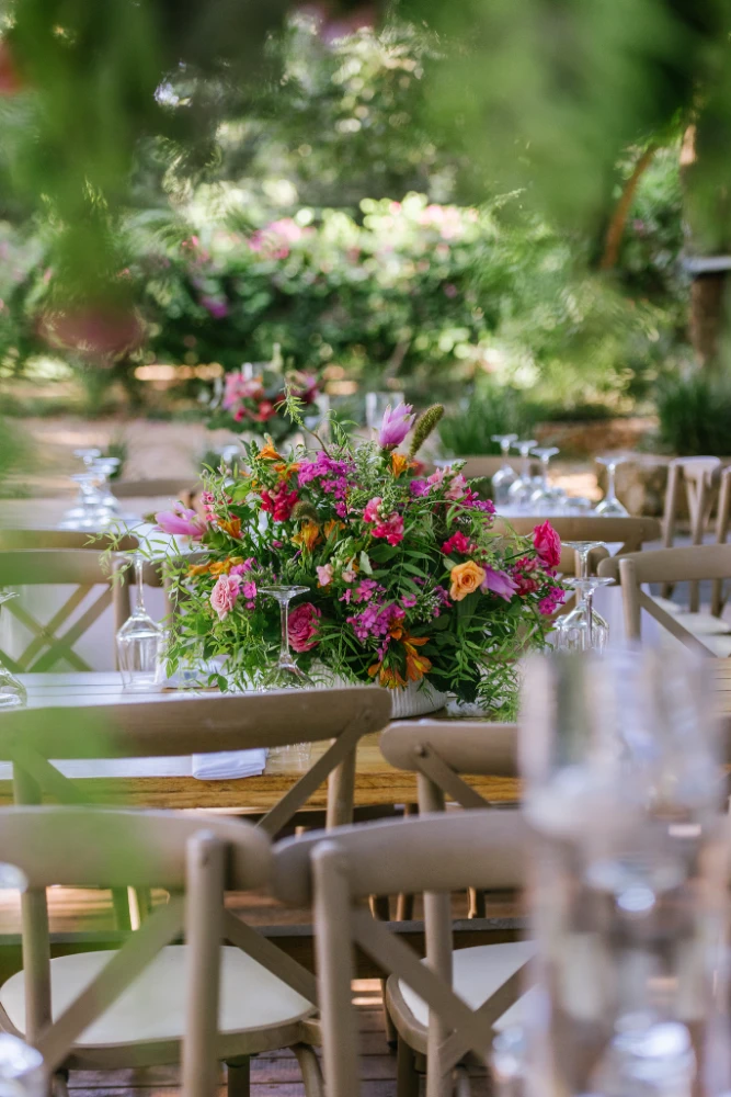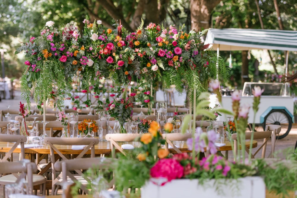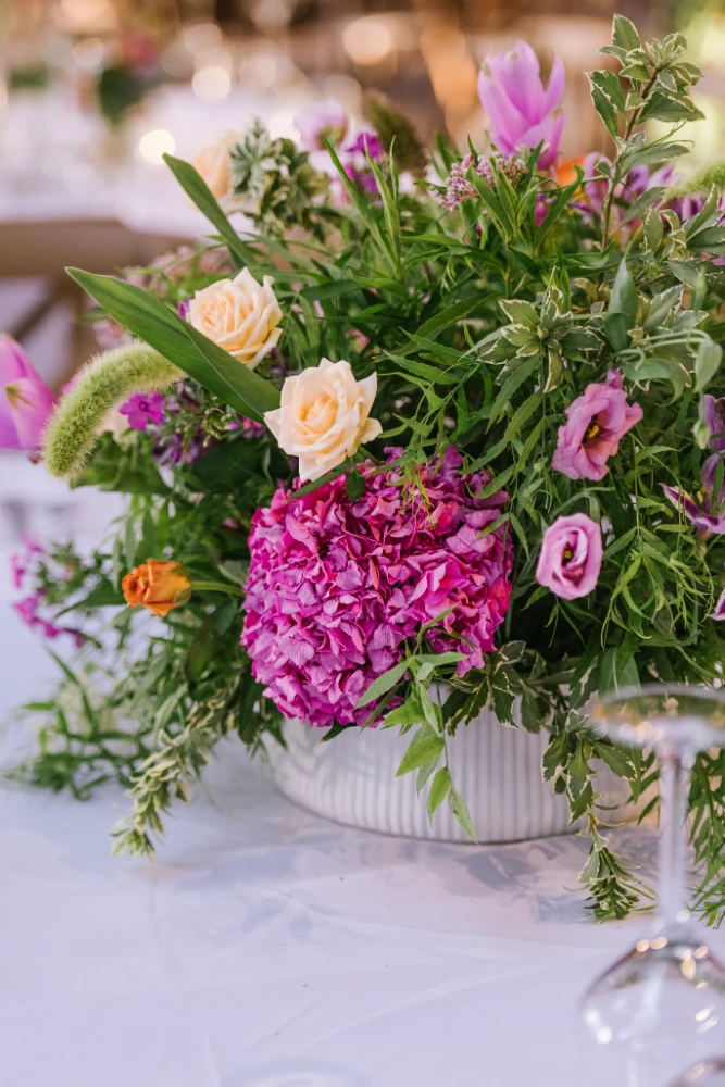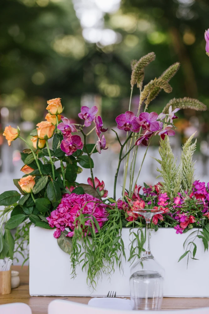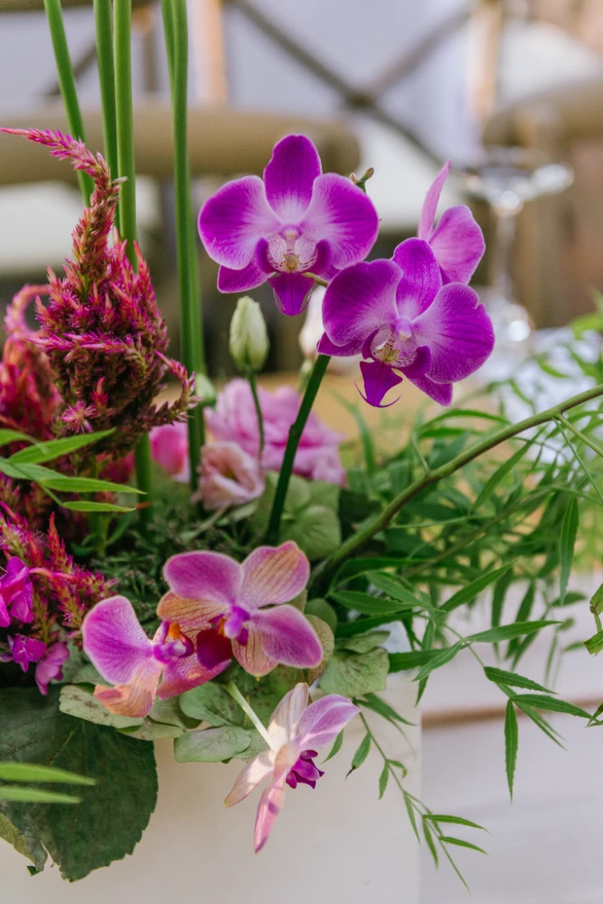 הצבעים שהובילו את העיצוב היו כתום, ורוד וסגול, שילוב צבעים חמים ומרגיעים שהפכו את החלל למקום קסום ומיוחד. השילוב בין צבעים עזים ודרמטיים ליצירת מראה מלא חיים, יחד עם מיקס של גבהים בעיצוב השולחנות ובפרחים, יצר אווירה ייחודית שגרמה לכל מי ששהה באירוע להרגיש כאילו הוא נמצא בעולם אחר – צבעוני, מלא תעוזה ומרענן.