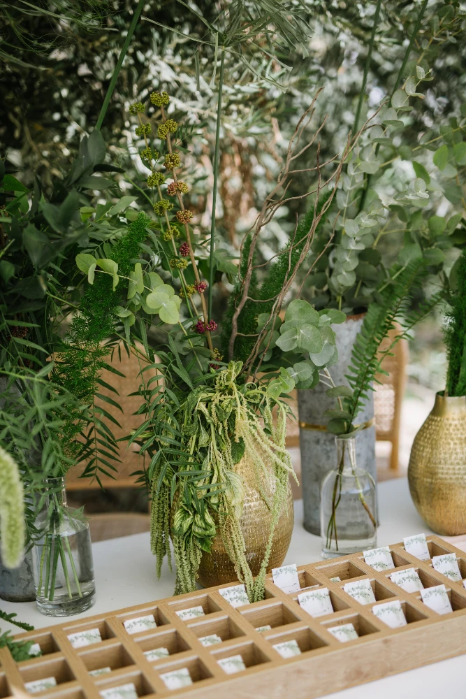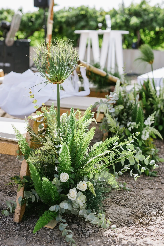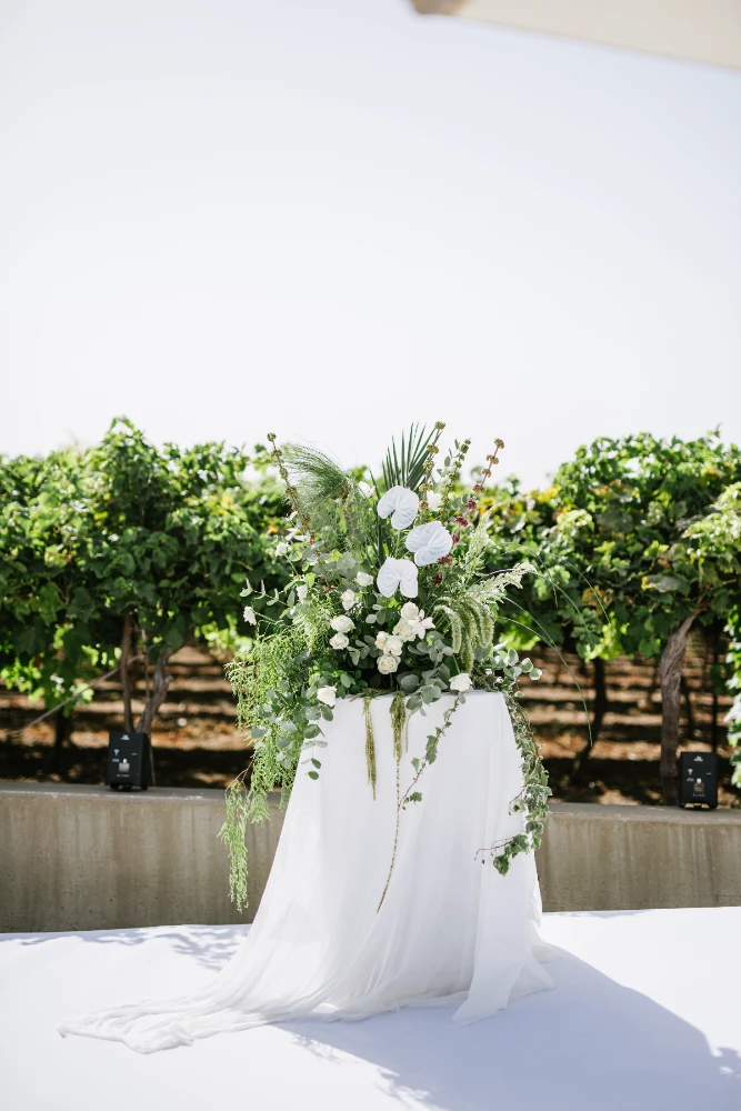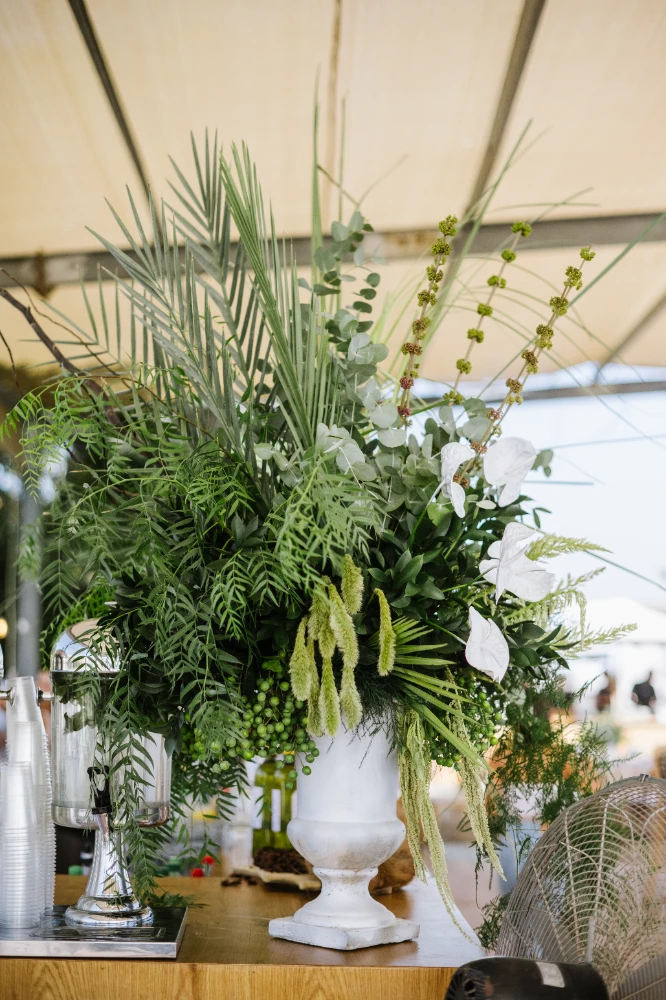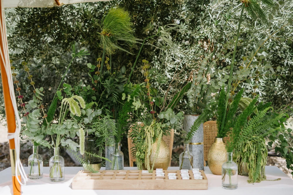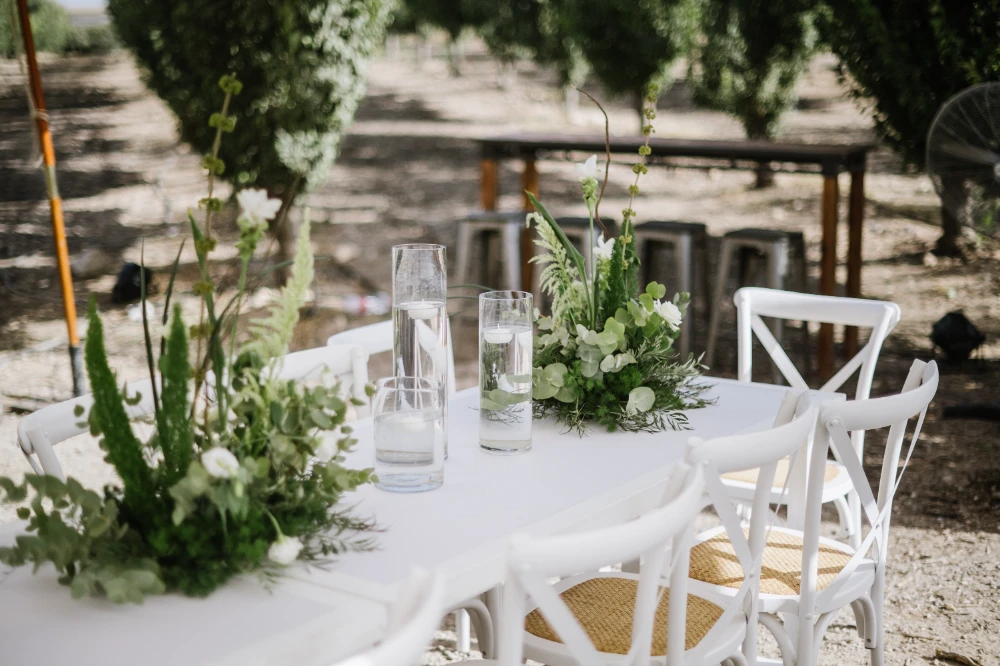 החתונה הייתה כולה בגווני ירוק עזים, כשהשדות הפתוחים של כרמי יוסף שימשו רקע קסום ומרגיע. השילוב של הירוק עם אנטוריומים לבנים, יצר איזון מושלם בין הטבעי והאלגנטי. העיצוב שיחק עם אלמנטים טבעיים ומודרניים, כשהצבע הירוק היה הדומיננטי, והאנטוריומים הלבנים הוסיפו נופך של רעננות, ניקיון ופשטות יפיפייה.