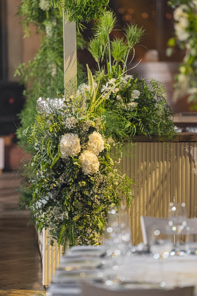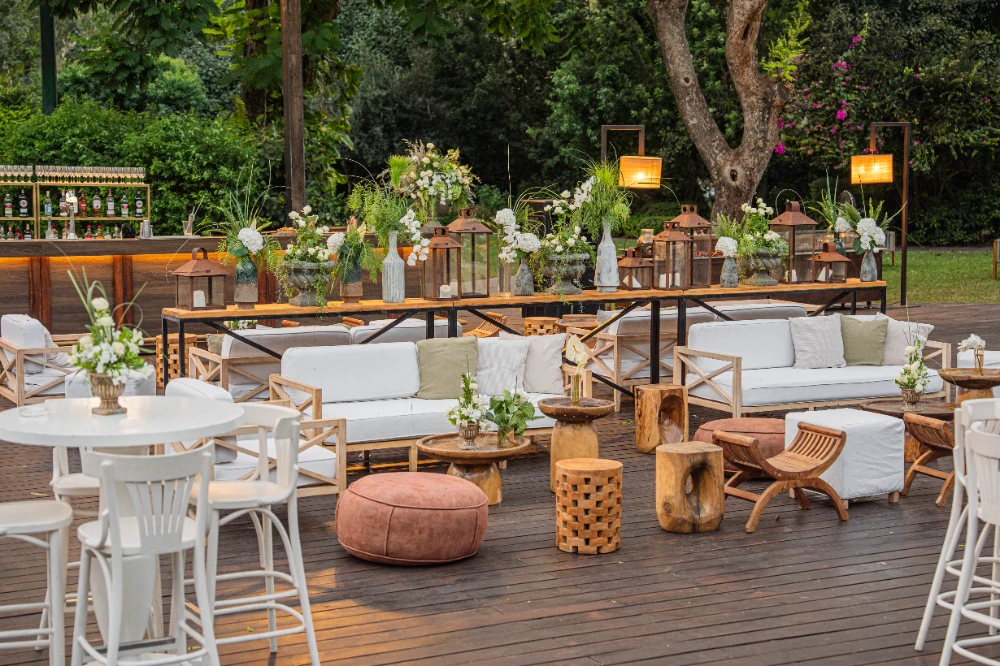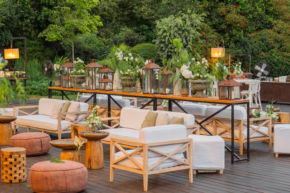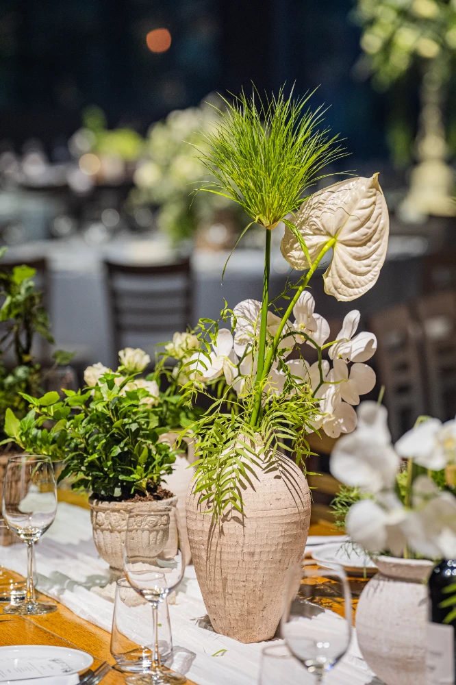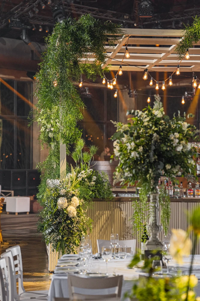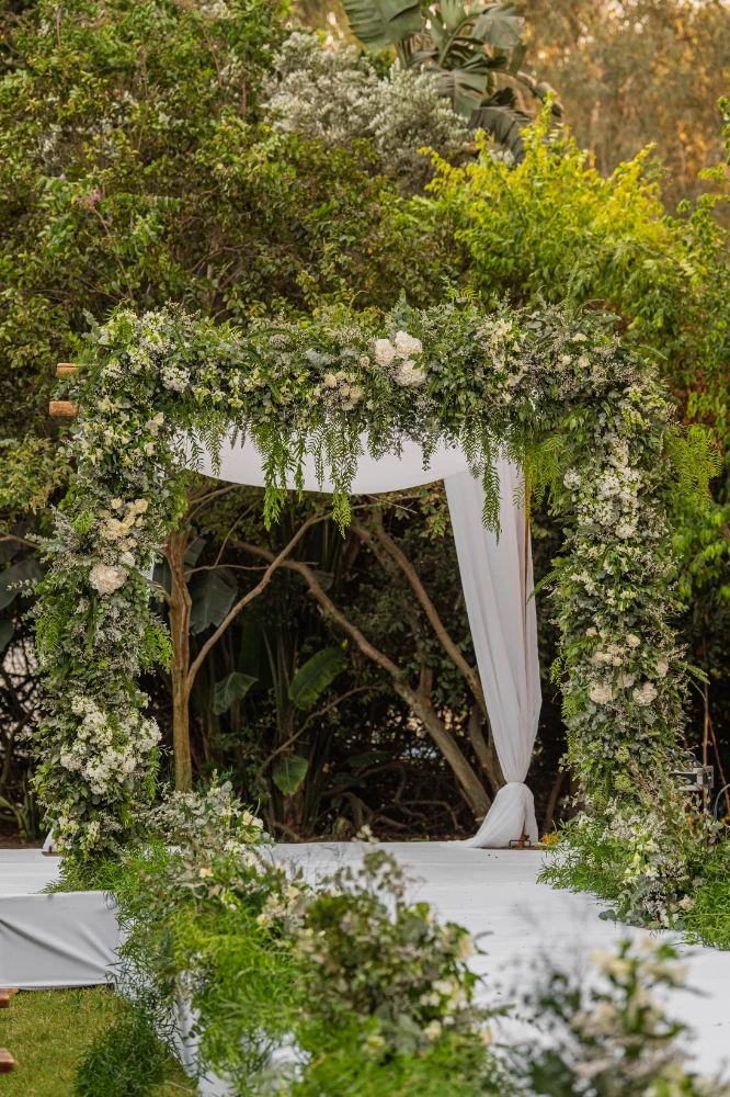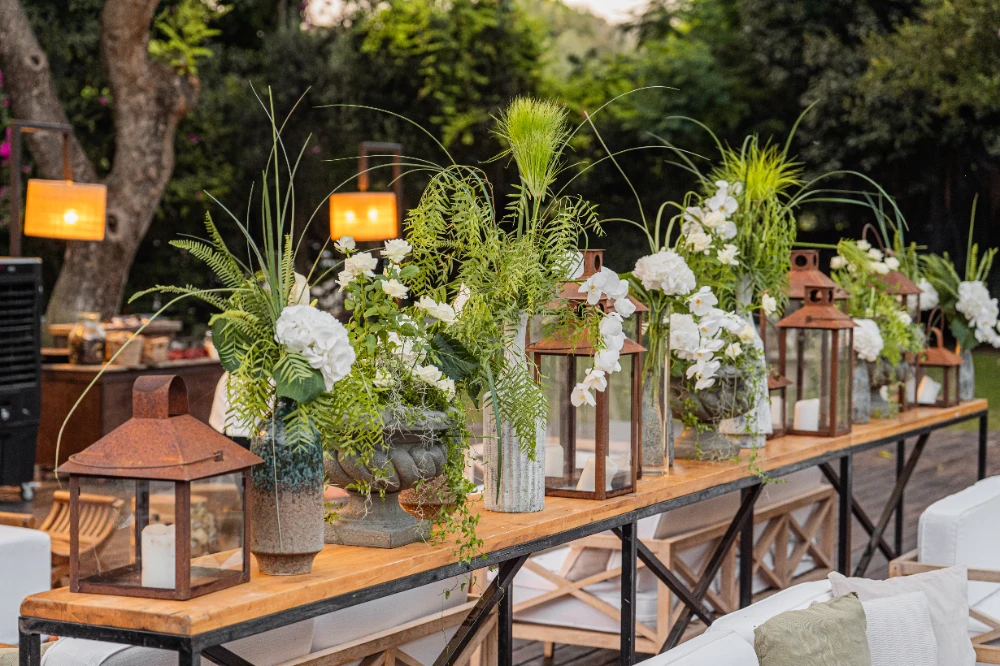 את השולחנות והפינות המעוצבות השלמנו עם כלי חרס בסגנון יווני — טקסטורות טבעיות, צורות נקיות, ותחושה של אותנטיות ים־תיכונית. לצידם נבחרו ספות וכריות בגווני חום, ניוד, לבן וירוק — שילוב מאוזן ורגוע שהעניק לאירוע מראה טבעי, הרמוני ונצחי.שיא הערב היה החופה: עשירה, מלאה חיים, ומחאת פרחים מרהיבה שהשתלבה עם התאורה הרכה ועם המתחם כולו. פרחים בשפע, שכבות של ירוק, לבן וגוונים טבעיים יצרו תחושה של מרחב קסום, אינטימי ומרגש.זה היה אירוע שכולו מחשבה, דיוק, קסטום־מייד אמיתי, ואהבה גדולה ליובל וטל — וליופי של עיצוב שנוצר במיוחד עבורם.